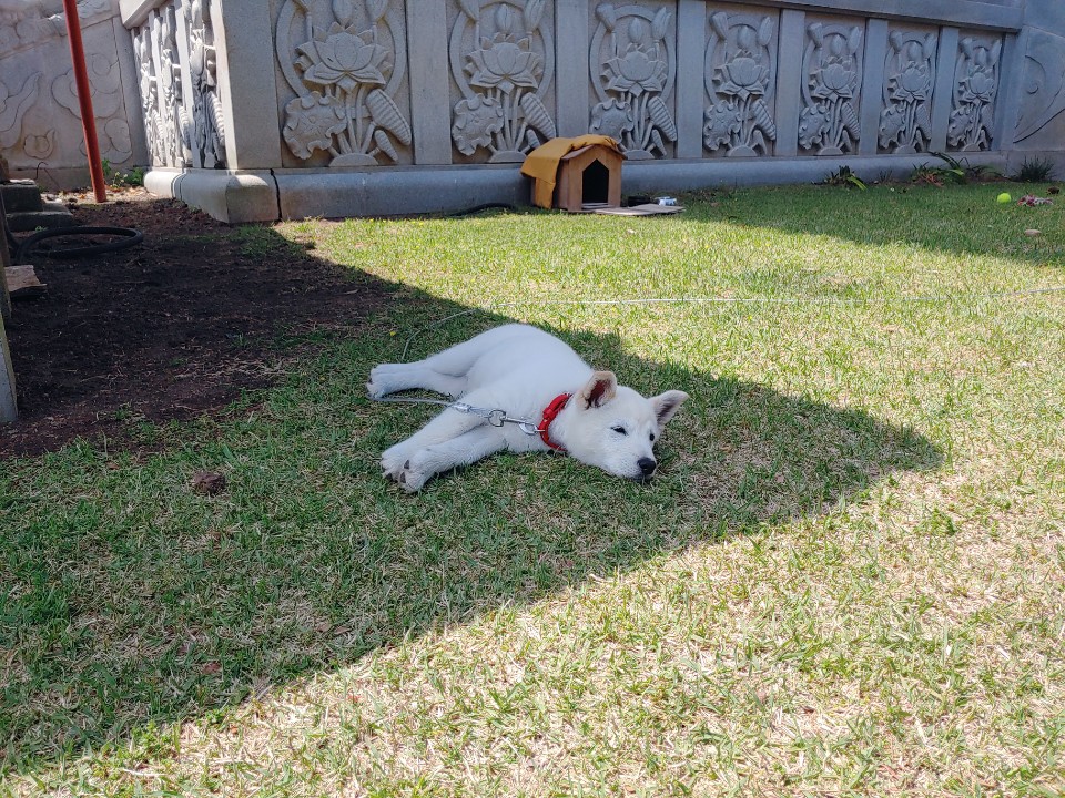 흰둥이 한 마리가 햇살이 따스한 오후를 나른하게 보내고 있다.