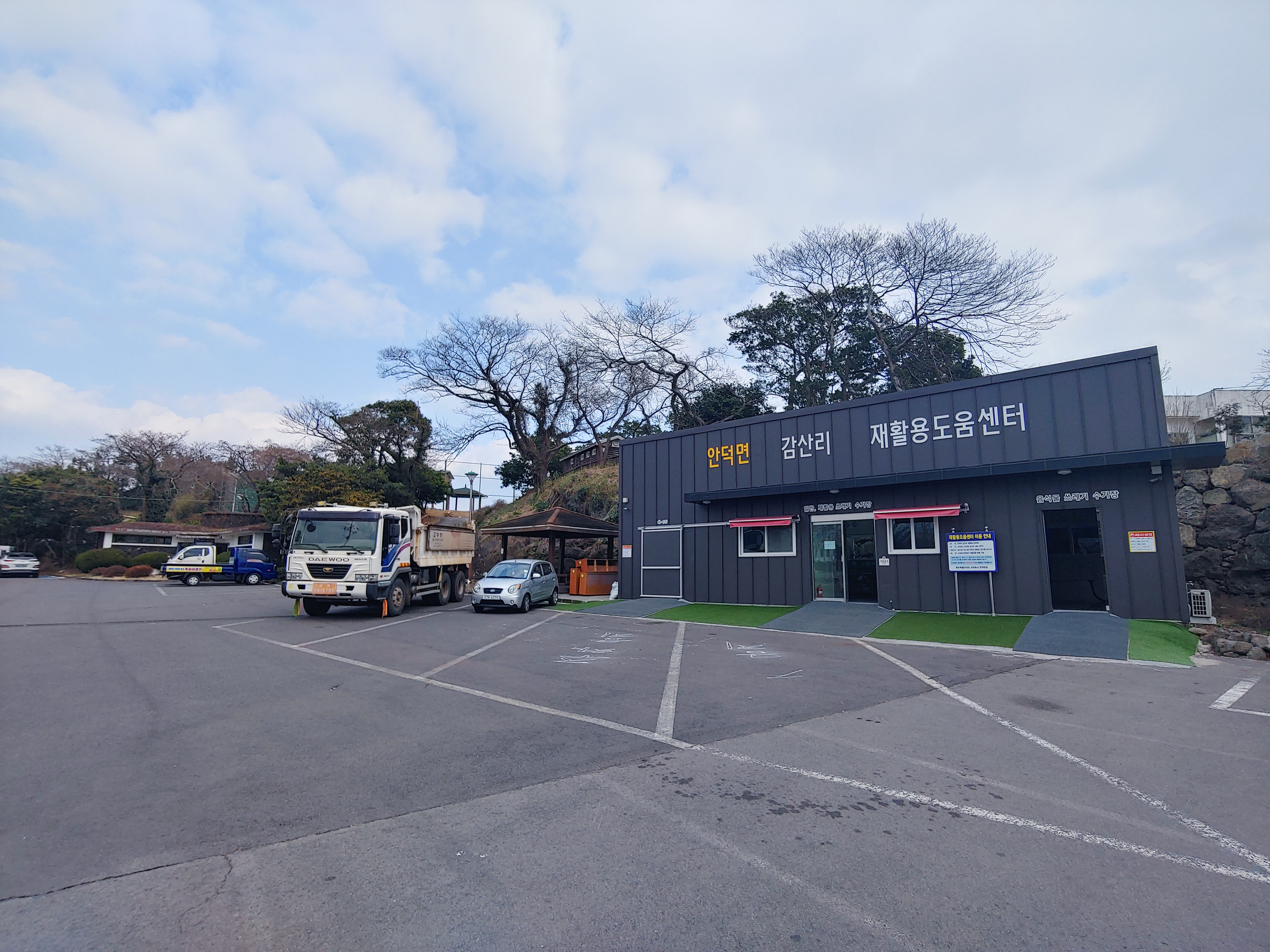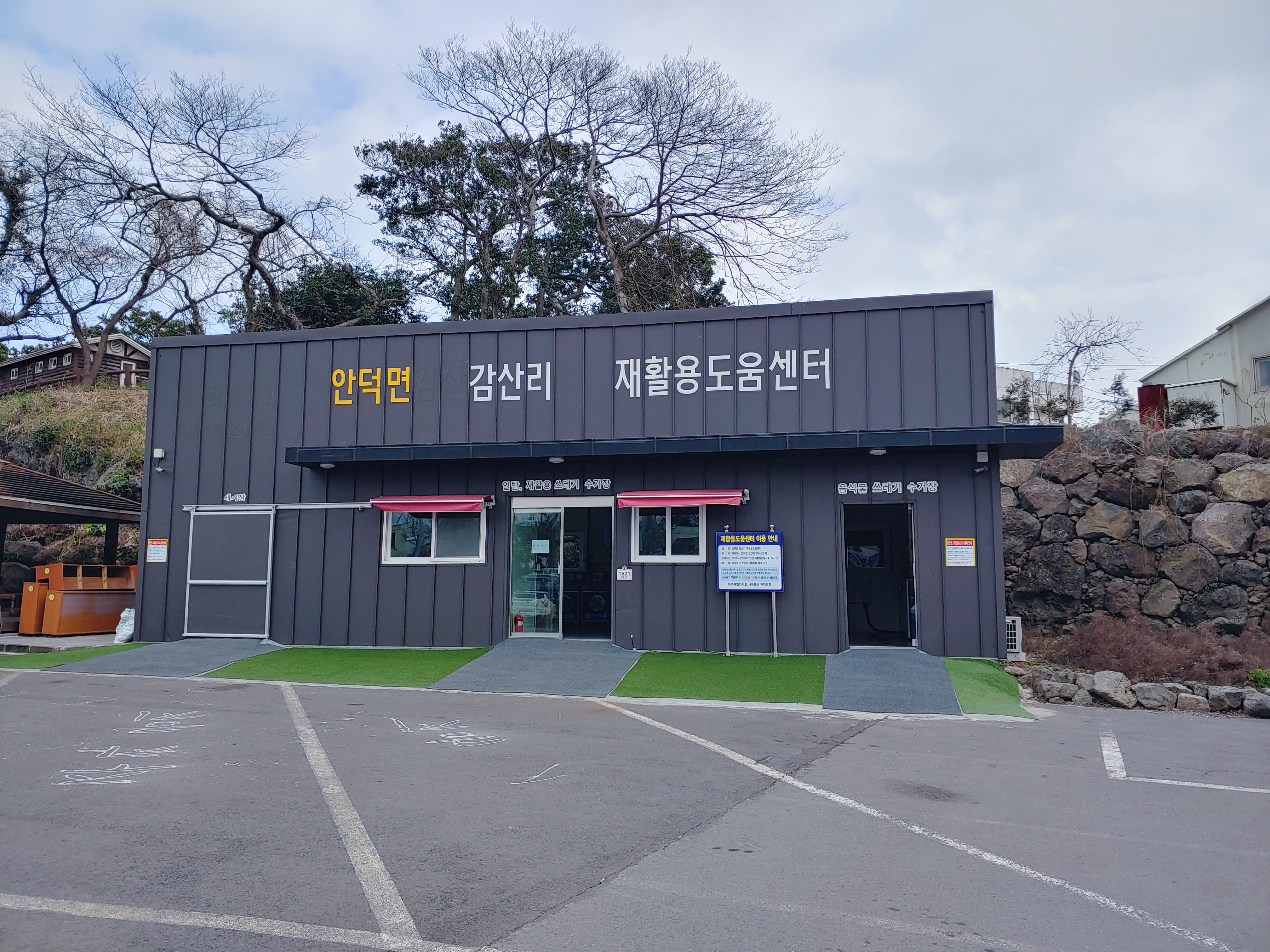 위에 사진처럼 안덕계곡 주차장에는 재활용도움센터가 있다. 요일마다 지정된 종류의 재활용쓰레기만이 아니라, 언제나 가서 분리수거할 수 있는 곳이다.