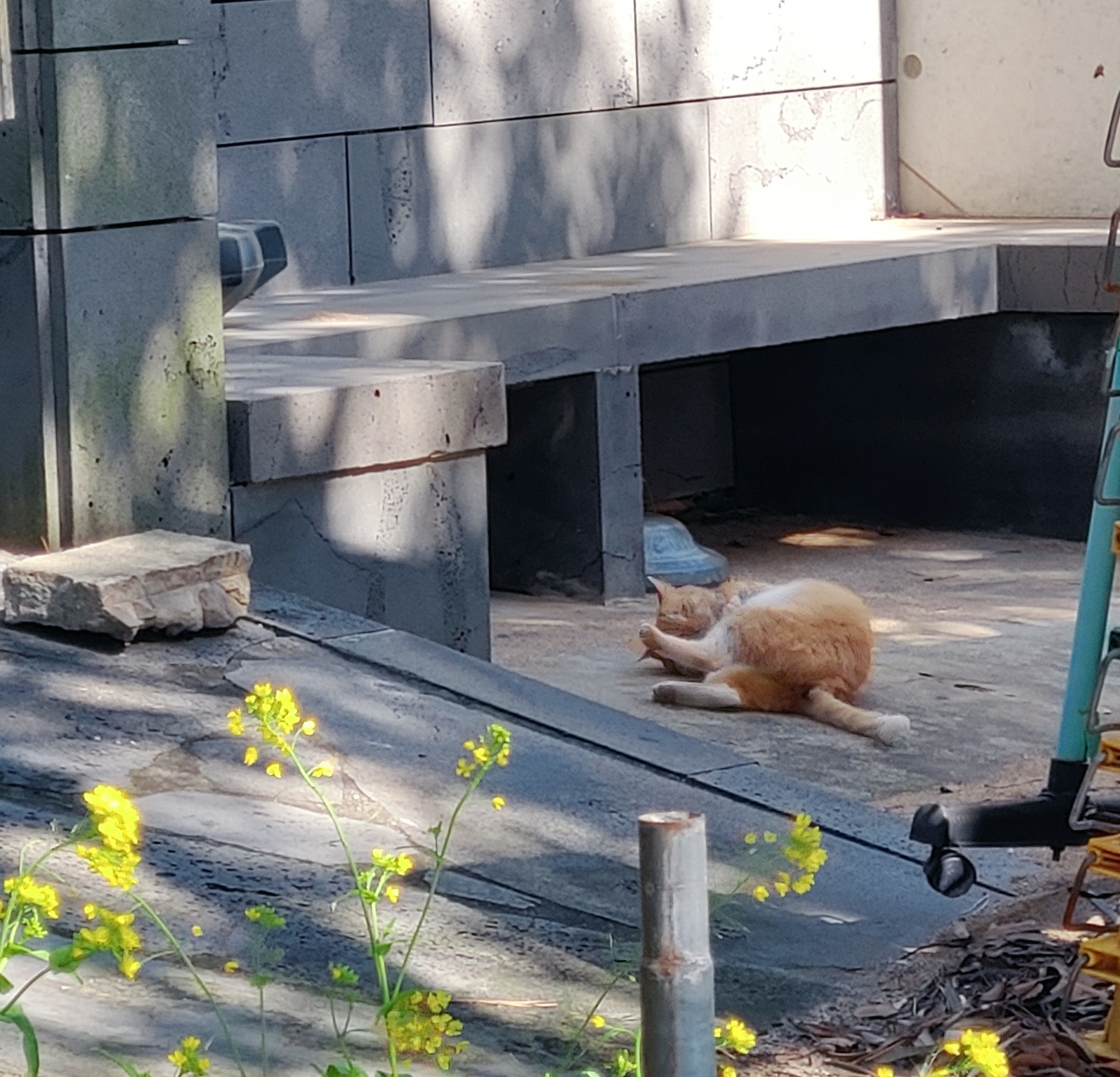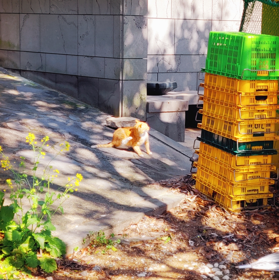 Spring is for stray cats! A yellow Korean short tail is playing near w/c bd at parking lot of Jungmun beach in Jeju, South Korea.