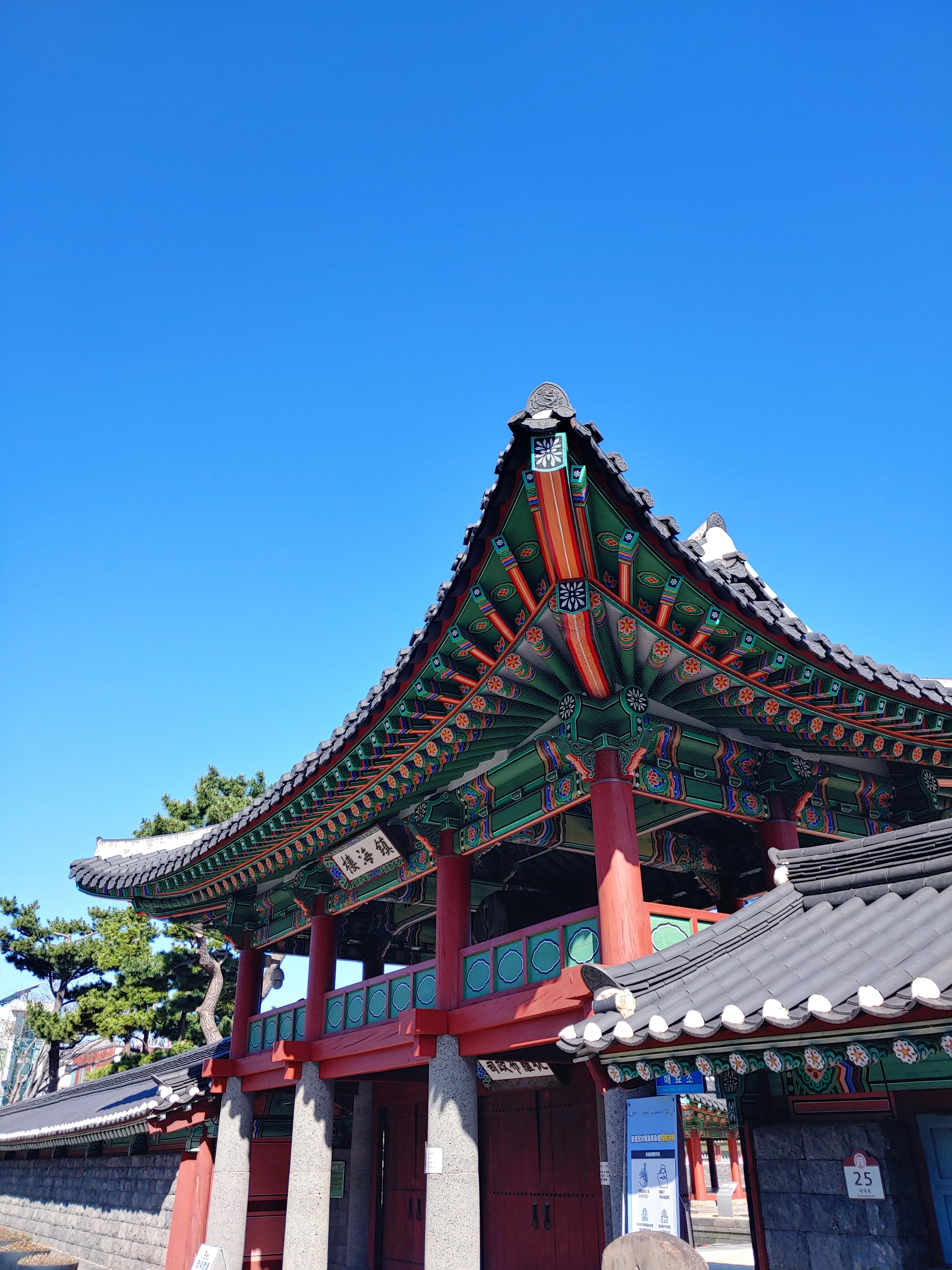 Dancheong, traditional multicolored paintwork on wooden buildings <def. in naver dictionary>, looks even more beautiful on a fine early spring day in Jeju, South Korea.