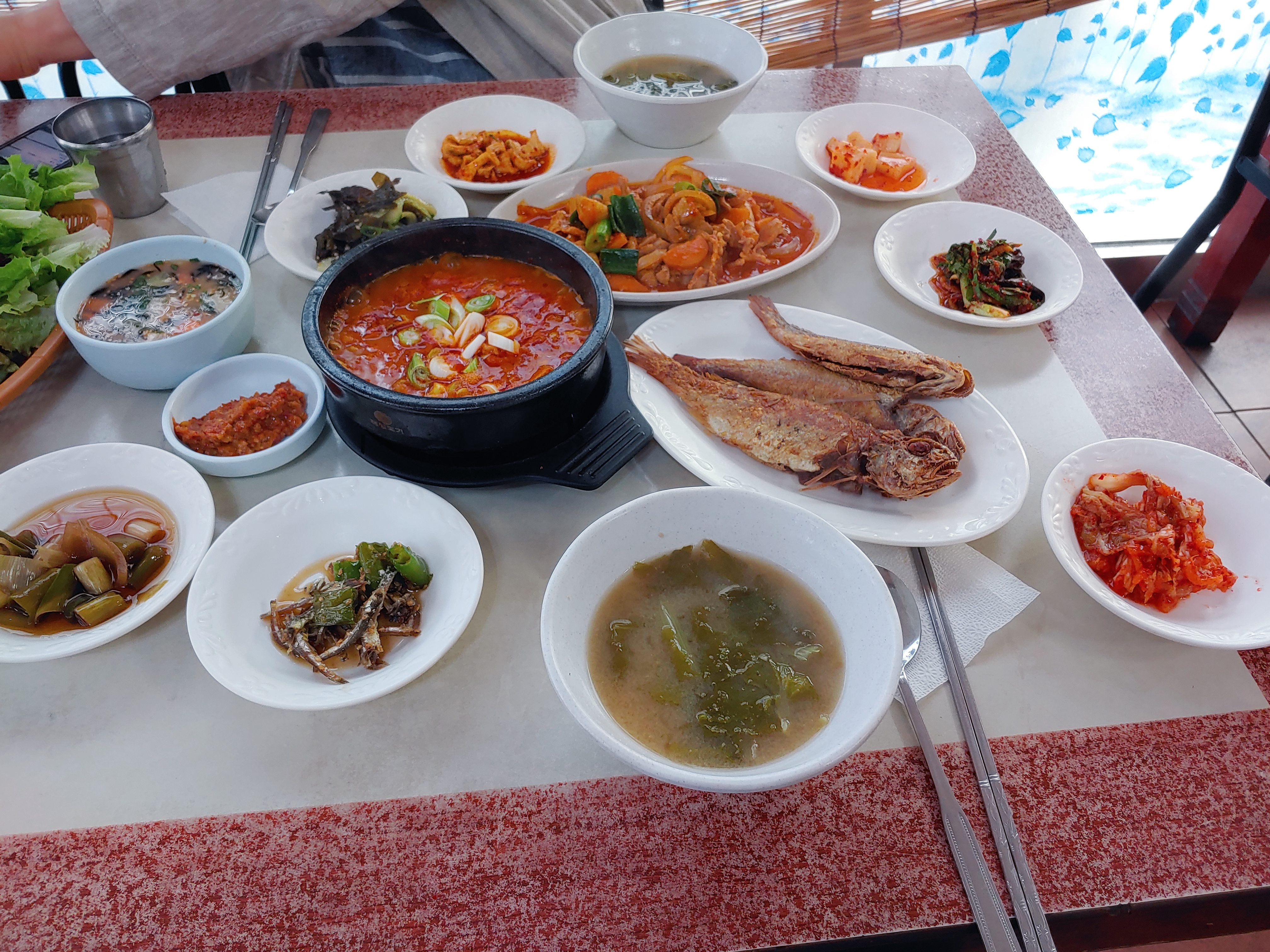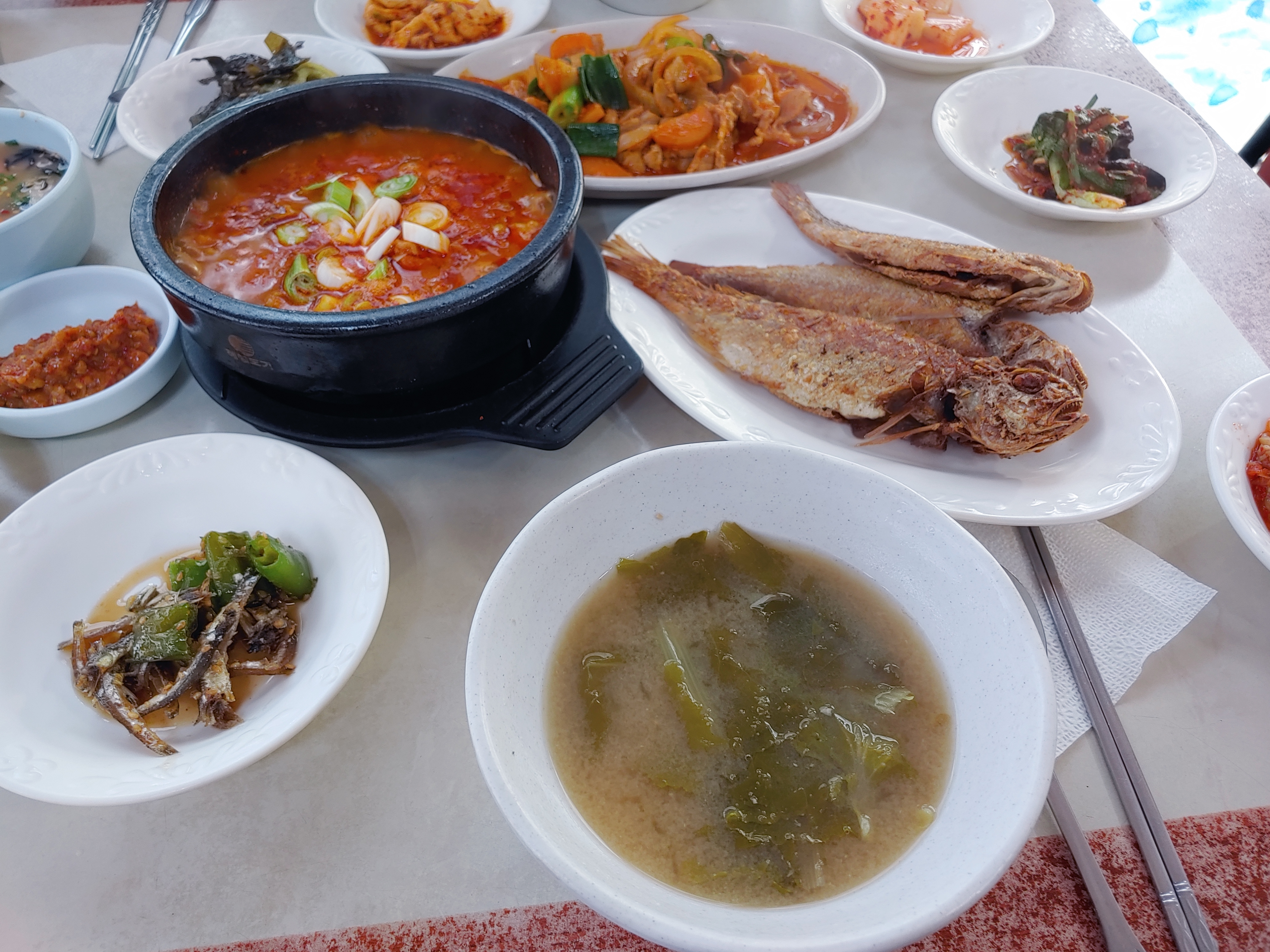 It serves three main dishes of jjigae(stew), bokkeum(stir-fried), and saengseon-gui(grilled fish) with assorted side-dishes at 8kKRW(appx. 7 USD) only.