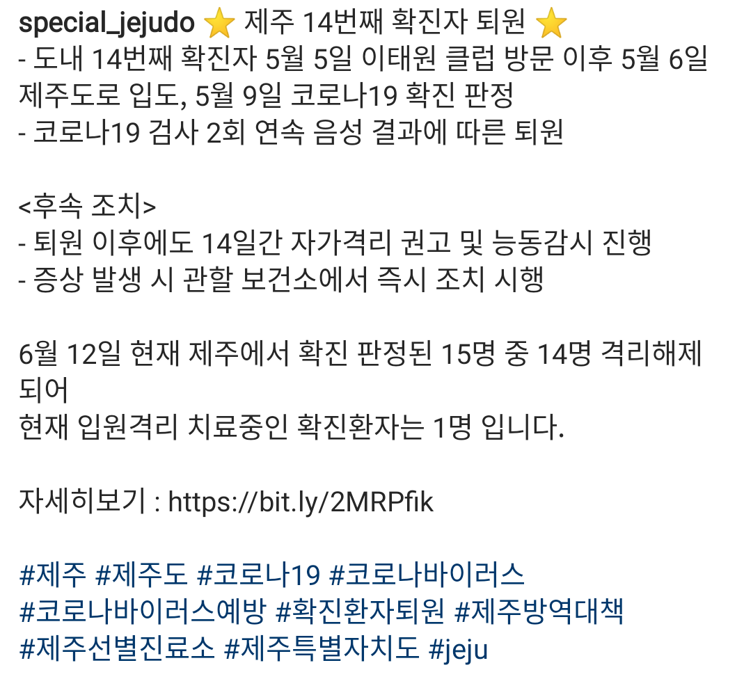 이로써 이태원 발 코로나19 2차 파동이 제주도에선 공식으로 완료됐다. 그 결과 제주도에는 이제 미국 방문 후 확진판정을 받은 15번 환자만 남았다.