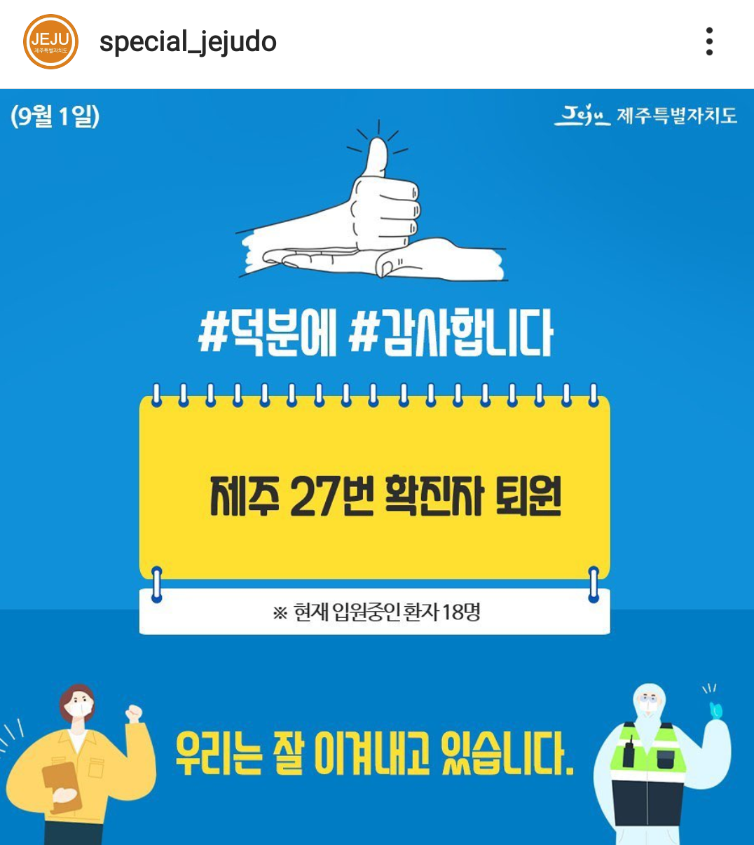 제주도에서도 코로나19 확진자가 줄줄이 나오는 가운데 27번 확진자가 퇴원했다는 소식. 지난달 20일 타 지역 확진자와 접촉한 사실 통보 받은 뒤 검사에서 확진 판단을 받은 사례다.