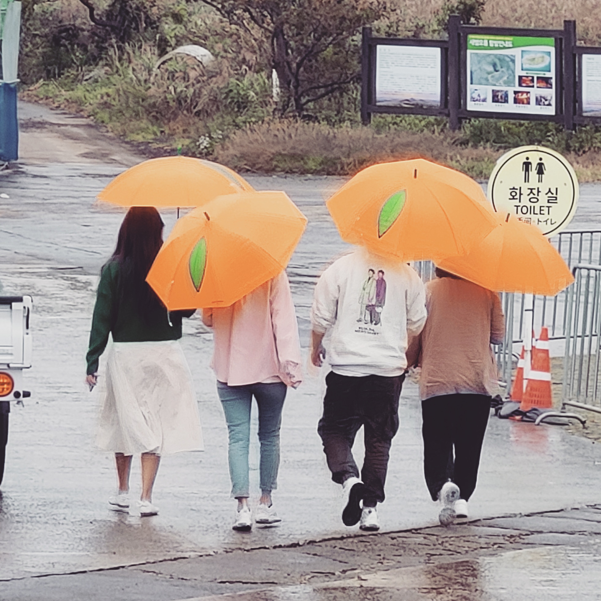 한 가족이 감귤우산을 쓰고 나란히 걸어가고 있다. 제주만의 풍경이 아닐까?