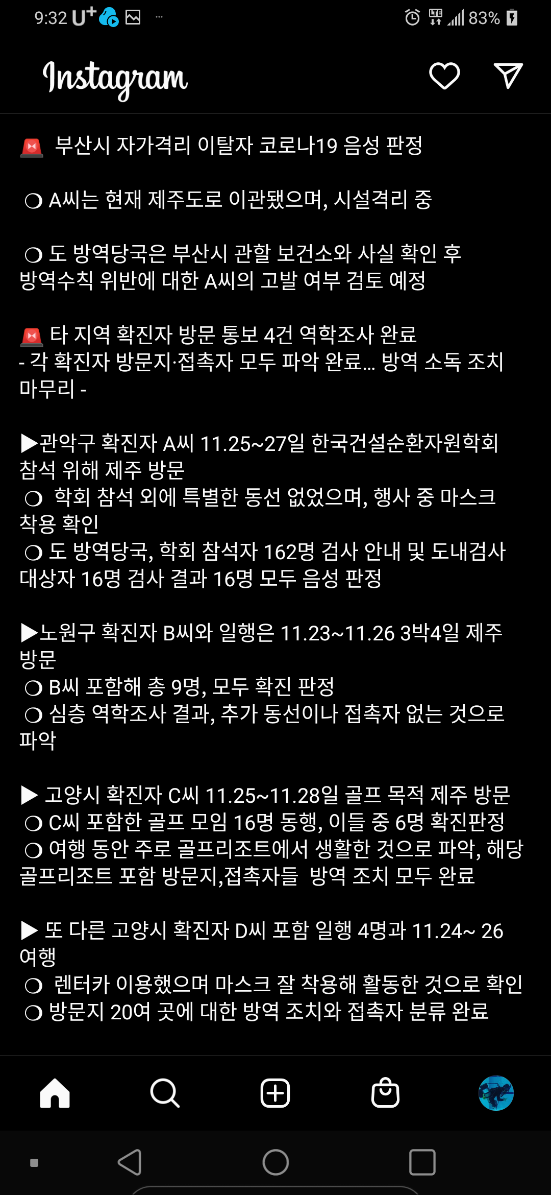12월 4일 접촉자 통보 받았지만 연락 두절. 이후 제주도 입도 사실 확인. 다음날 오후 7시경 신원 확보. 당시 연동에 이었다는데, 사람 많은 곳이라 걱정이 되기도 한다.
