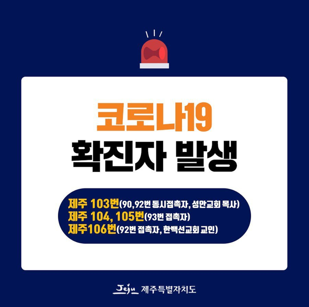 106번. 다른 교회 교인으로아라동 교회에서 회의 때문에 92번 확진자와 세 차례 접촉.